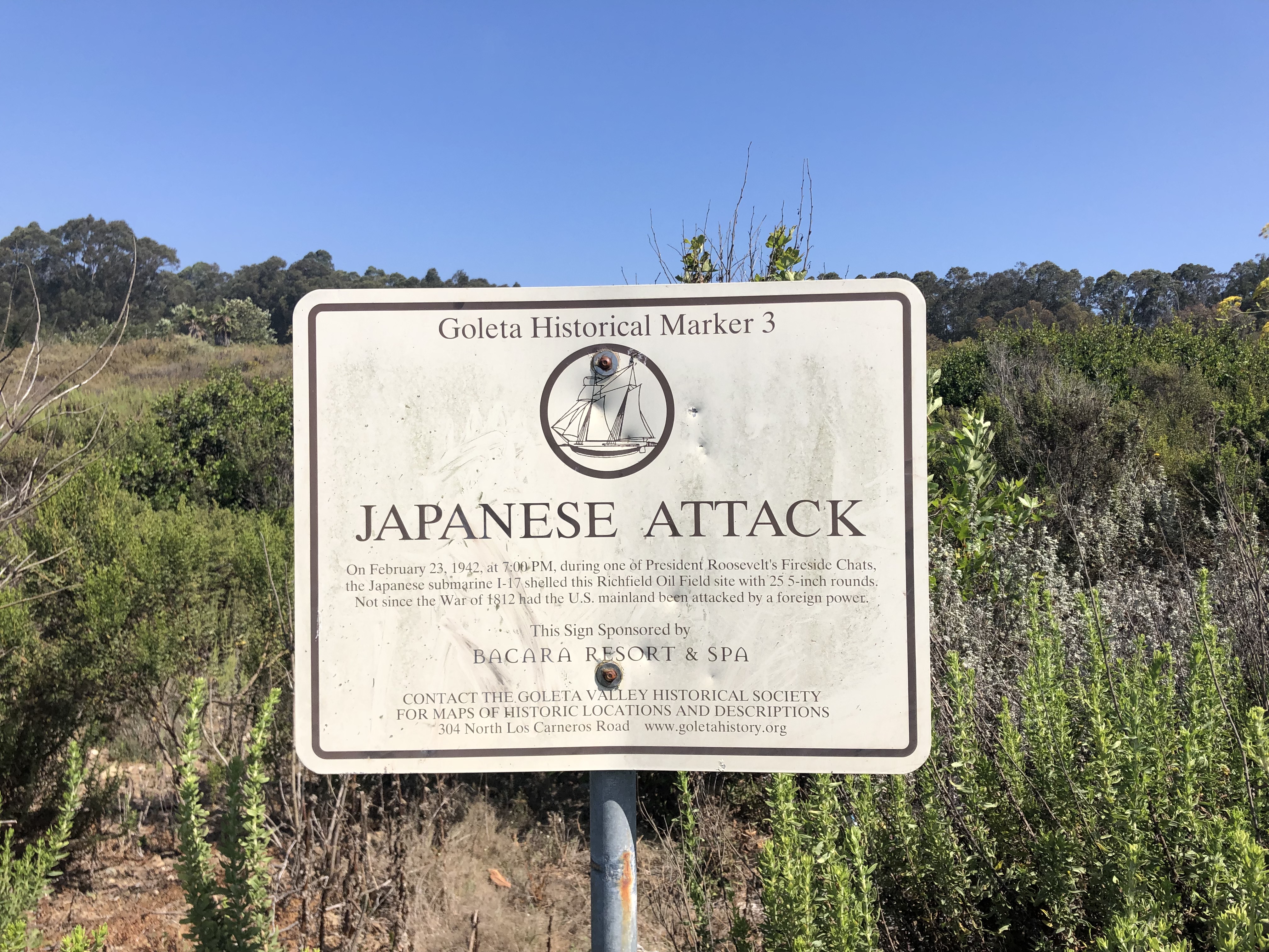 Eventually Alison had to move on to a meeting, and so it came time to leave UCSB and head north up the coast. Santa Barbara is actually a big “oil town,” in that the shoreline is essentially a thin crust of sandy soil atop pools of oil and tar. It was not uncommon, during my undergraduate days, to have tar stuck on the soles of my feet from walking barefoot on the beach. Offshore breezes send the cloying smell of petroleum into the town. Oil drilling platforms dot the horizon just beyond the state territorial limit. Refineries occupy prime real estate near the shore. One such refinery was actually the target of offshore shelling by Japanese submarine in 1942. As I read the commemorative sign (below), I was reminded that, on a trip to Oregon a few years back, Ian and I stumbled upon coastal site where the Japanese had floated incendiary bombs by air in an effort to start forest fires. Don’t ever let anyone tell you that the US mainland wasn’t attacked during the war.