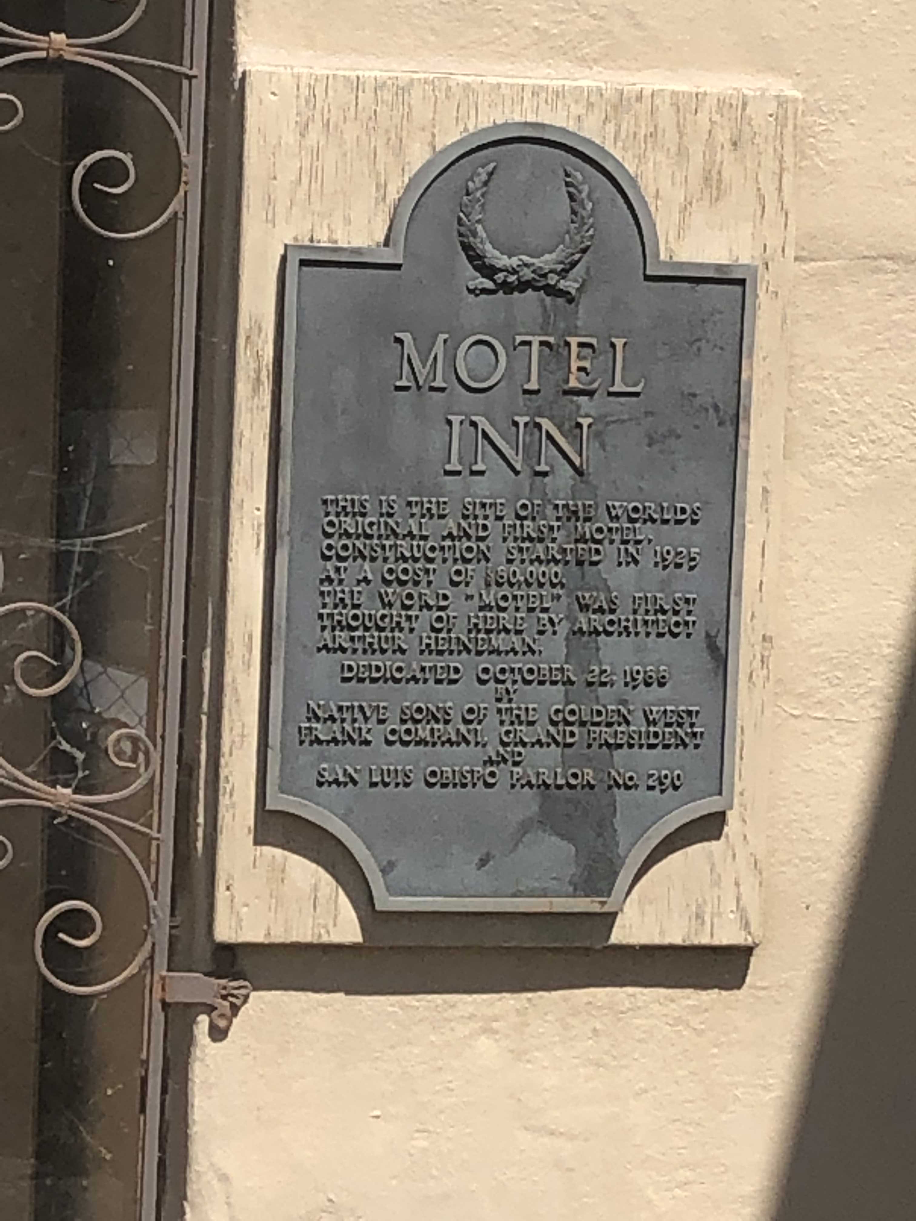 - The whole “Motor Hotel” story seems a little shaky. The plaque claims the name “motel” was the brainchild of the architect, not the clever expediency of the sign painter.