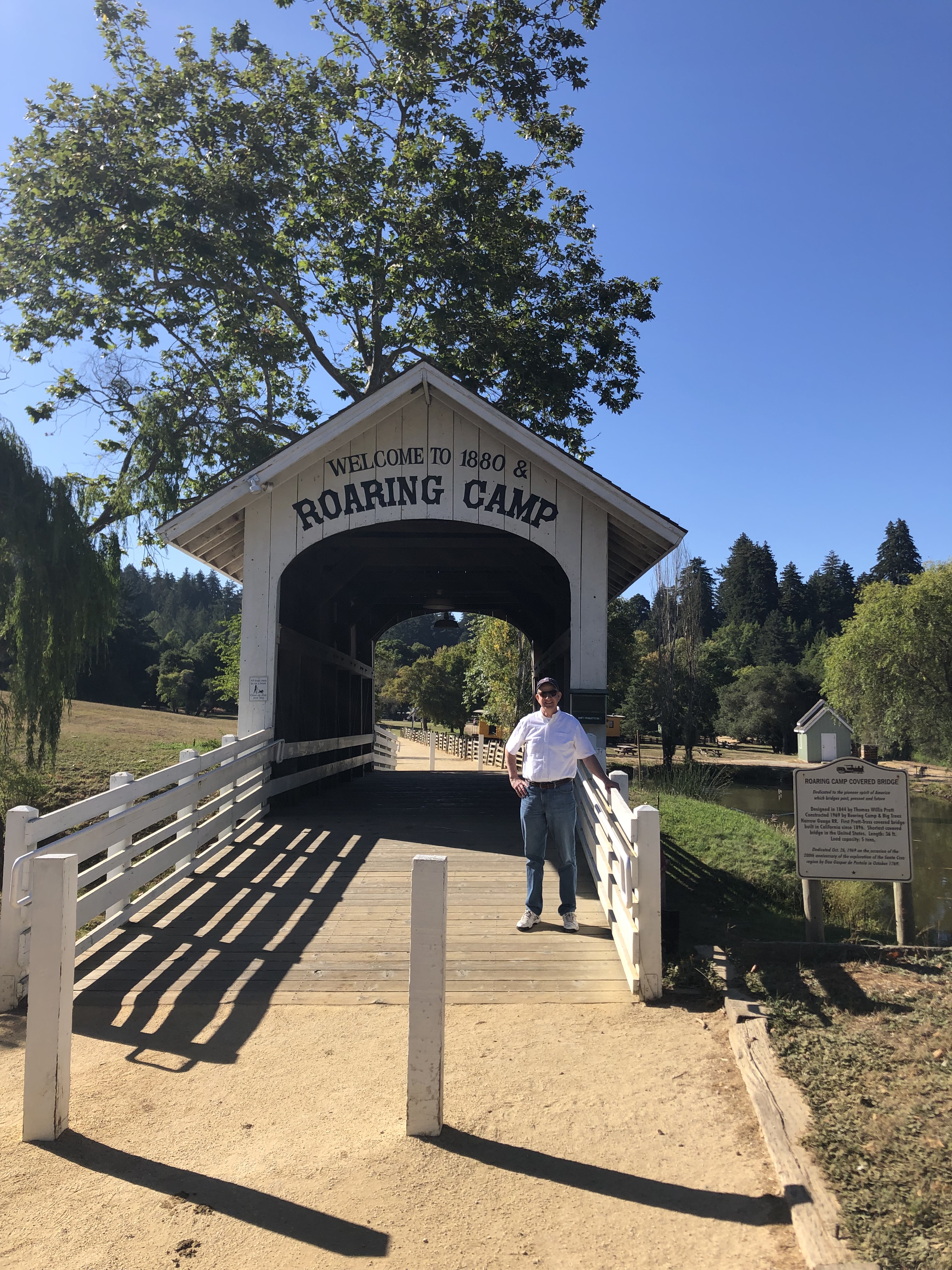 We rendezvoused at Roaring Camp, which is a narrow gauge railroad set among the redwoods in Felton. It’s a re-creation of a late 19th/early 20th century logging railroad, with authentic steam locomotives, a depot, a general store, a water tower, and other elements of an old logging camp. We had gone there as a family a few times in the late 1960s and early 1970s, and rode the train on the one-and-a-half hour loop through the redwoods. Roaring Camp is situated right next to Henry Cowell State Park, so we’d sometimes walk over to the trains while we camping or picnicking at the park. Those were good memories.