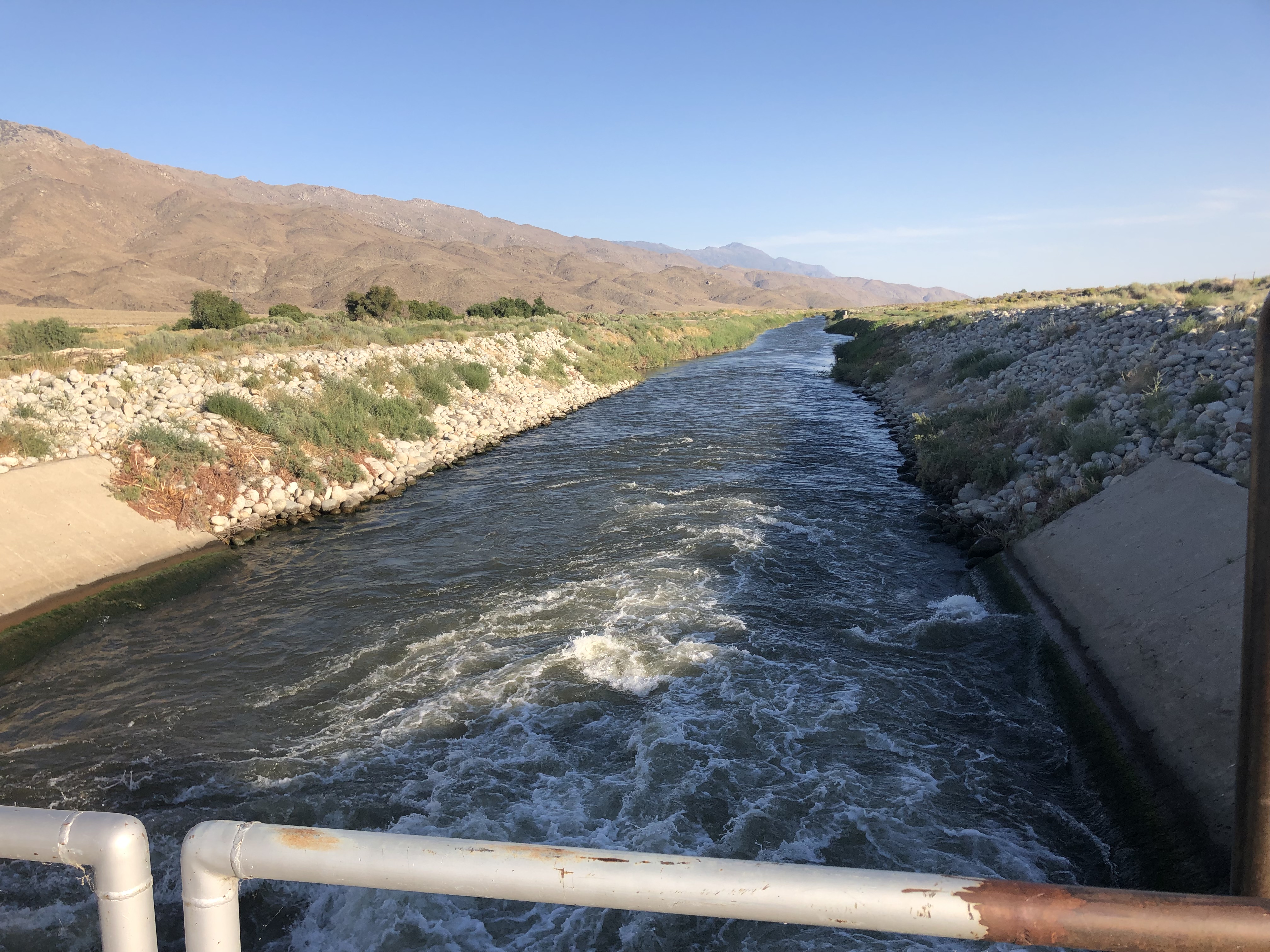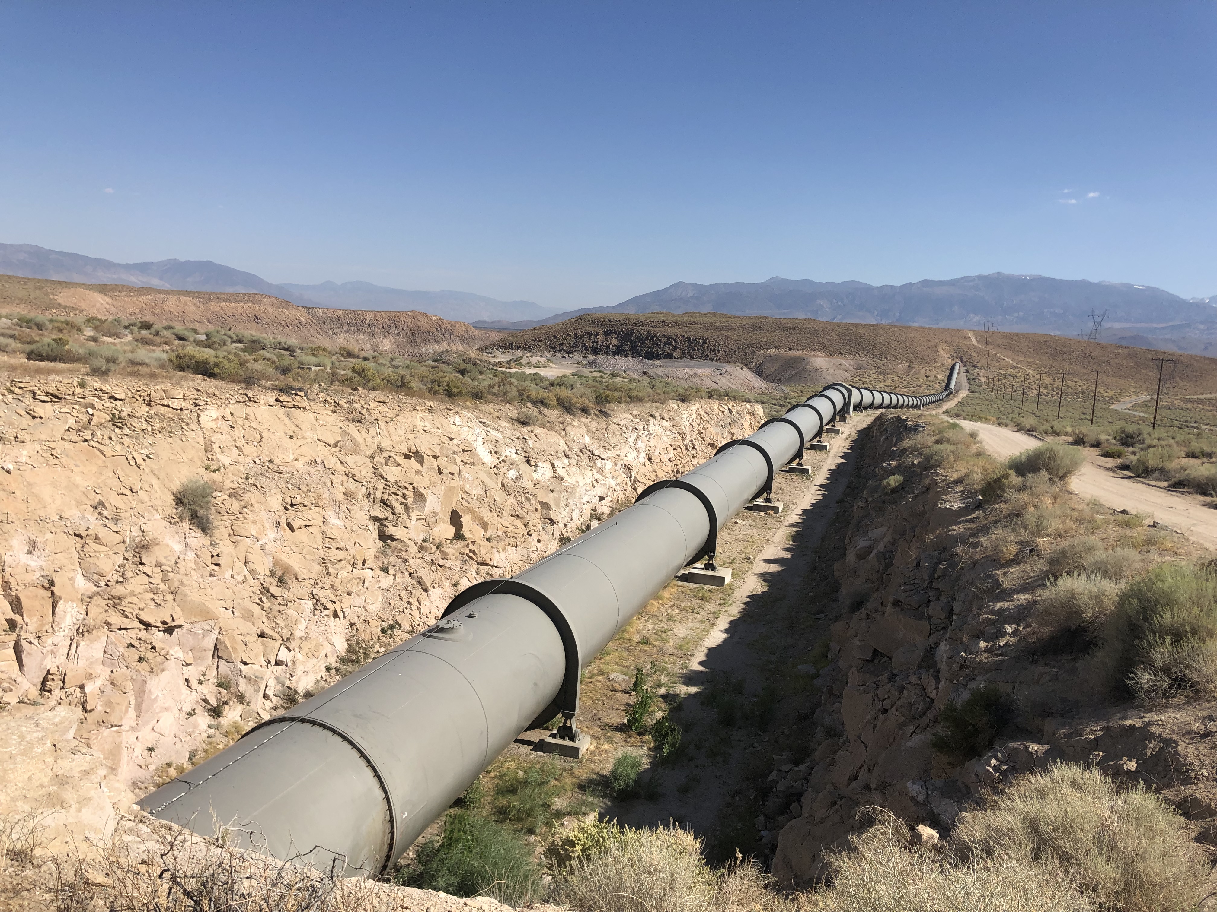 A sign said this was the property of LADWP [Los Angeles Department of Water and Power], so surely this was the pipeline. I put my ear up to the metal wall of the pipe and heard running water. I had expected the metal, which had been baking in the arid, 90-degree heat, to be hot to the touch. But it was refreshingly cool. Stopping to think about it, that makes sense since they’re running zillions of gallons of snowmelt through the insides.