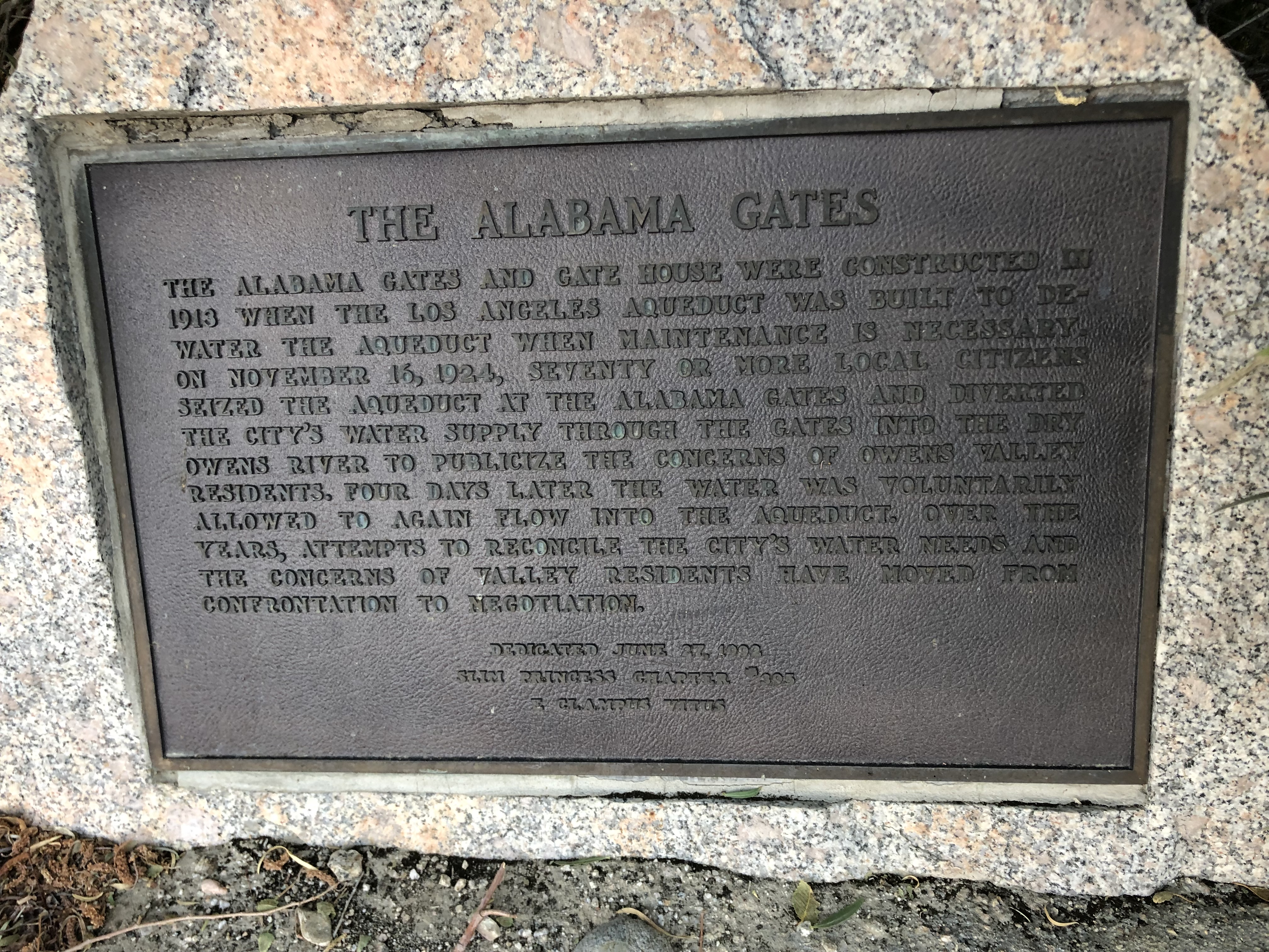 THE ALABAMA GATES The Alabama Gates and gate house were constructed in 1913 when the Los Angeles Aqueduct was built to dewater the aqueduct when maintenance is necessary. On November 16, 1924, seventy or more local citizens seized the aqueduct at the Alabama Gates and diverted the city’s water supply through the gates into the dry Owens River to publicize the concerns of Owens Valley residents. Four days later the water was voluntarily allowed to again flow into the aqueduct. Over the years, attempts to reconcile the City’s water needs and the concerns of Valley residents have moved from confrontation to negotiation.