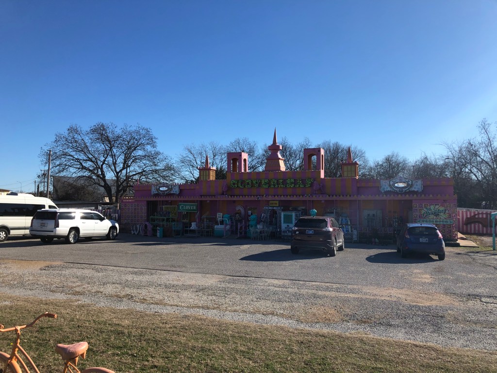 Later, I found myself in Ardmore, OK (population: 25,000). My eye was caught by a garish pink structure that at first reminded me of the Madonna Inn near San Luis Obispo. But it turned out to be an indescribable bazaar of miscellaneous, kitchy junk. It’s called “Cloverleaf.”