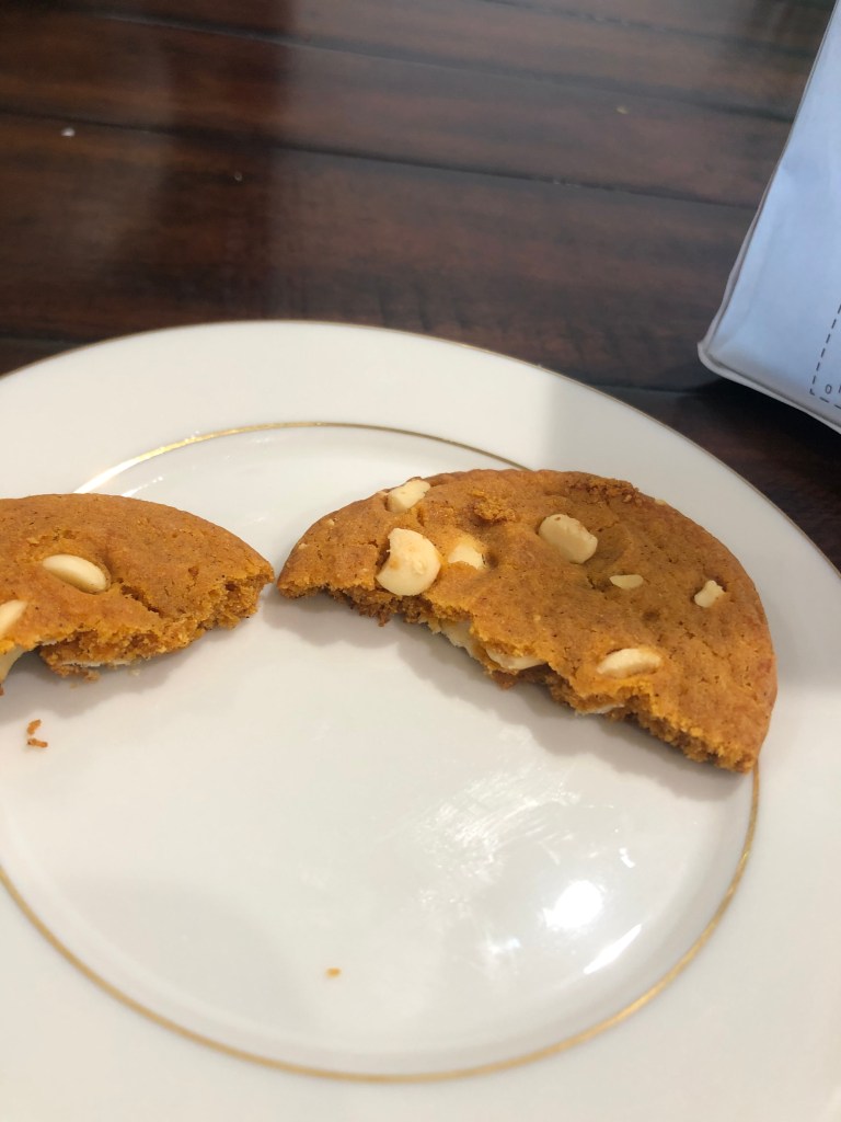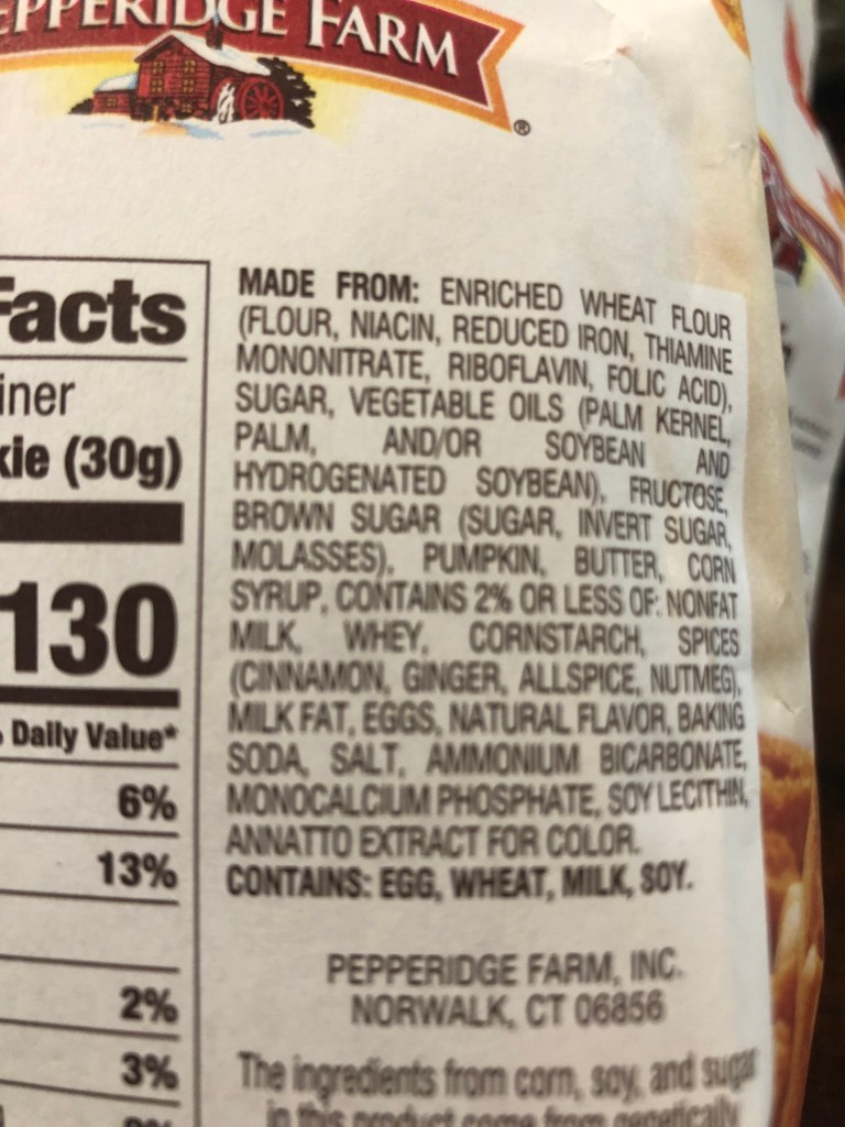 I understand the appeal of “soft baked,” but this cookie has all the character and appeal of a flat tire. The moist, not-quite-baked surface of this cookie adhered to its neighbor in the bag, and took a bit along with it on the way out. The whole cookie sags under its own weight as you raise it to your mouth. And what’s with these mystery chunks erupting here and there from the soft dough? They look like macadamia nuts, but there’s no mention of them in the ingredients list (see below). Are they accidental? Are they an amalgam of the other ingredients? Are they pumpkin nodules? Overall, this does not do a lot for me. No points.