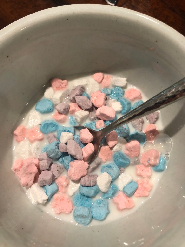 And then there are the “monster marshmallows.” They taste just like Lucky Charms’ marshmallows. They’re the only reason you’d ever really want to eat Lucky Charms. So let’s do a little experiment: I carefully isolated a bowl of just the marshmallow bits, added milk, and ate a few spoonfuls. The verdict? These things are disgusting. No points. I should have tried the Count Chocula.