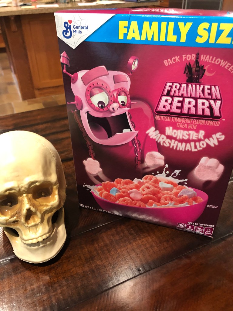 Today Count Chocula, Frankenberry, and Booberry are available for a short time each fall, around Halloween. So I picked up a “family size” box of Frankenberry to see how it stacked up against my memory of it.