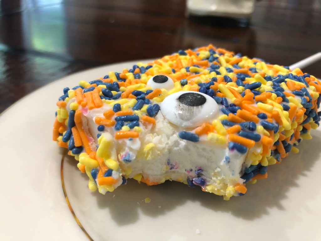 2. Appearance of the Treat. This thing is awesome! It’s got a little bit of a Sponge Bob vibe going on, at least in terms of the shape. The googly eyes are of different sizes, which adds to the comic effect. And then it’s heavily doused with yellow, orange, and blue sprinkles. The resulting monster looks like it could have been created at Jim Henson’s muppet workshop. This is an appealing confection indeed. 3 points.