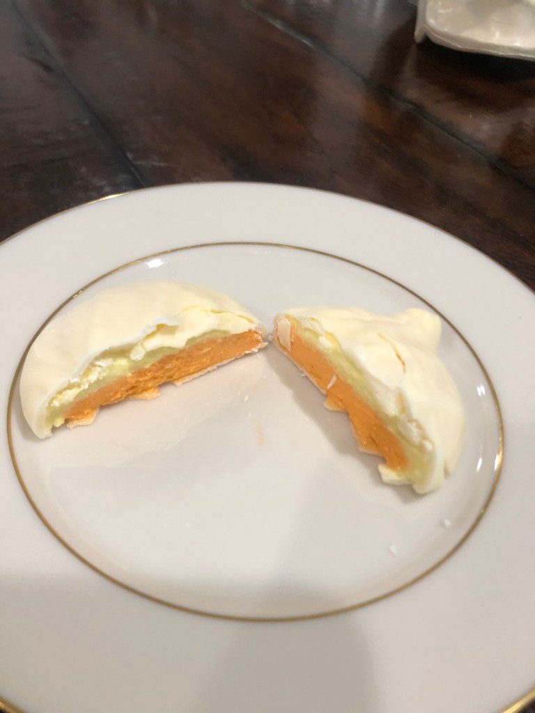 2. Appearance of the Treat. Alert readers will recall that I dismissed the other RS “pumpkins’ as resembling excreta. This one, however, benefits from having a color other than brown. In addition, the shape better conforms to that of a classic pumpkin. This is inoffensive. It’s even, dare I say, somewhat appetizing. Two points.