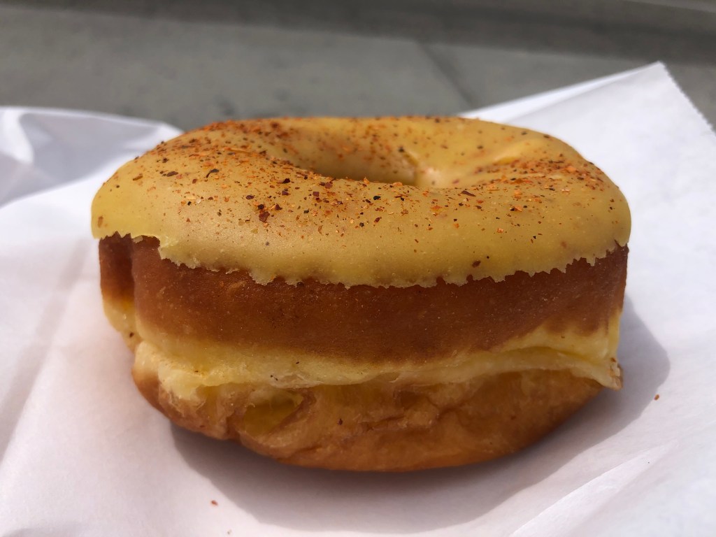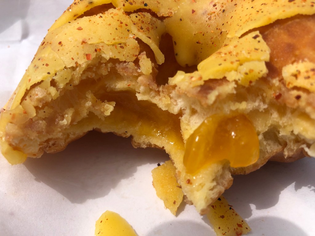 The first thing you notice biting into this “donut” is the heavy mango glaze. It cracked into pieces as I took the first bite, showering my lap with mango-icing shards. The next thing you notice is an overly-sweet, gooey mango filling, like the stuff they used to put in Hostess Pies when I was a lad. The third thing you notice is that the overall effect is rich and flavorful and robust; you’re overwhelmed with flavor and mouthfeel.