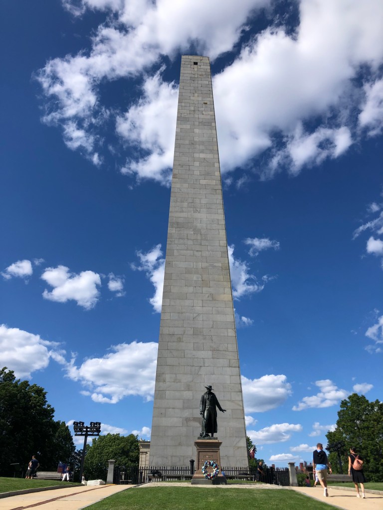 I asked a docent near the USS Constitution about the structure that “looks like the Washington Monument.” You’d think I insulted his family. He sharply informed me that it’s the Washington Monument that copied Boston’s memorial, and not the other way around. Boston’s memorial is the Bunker Hill Monument, erected between 1825 and 1843. (Construction of the Washington Monument didn’t begin until 1848.) We took a hike to get a closer look at the Bunker Hill version.