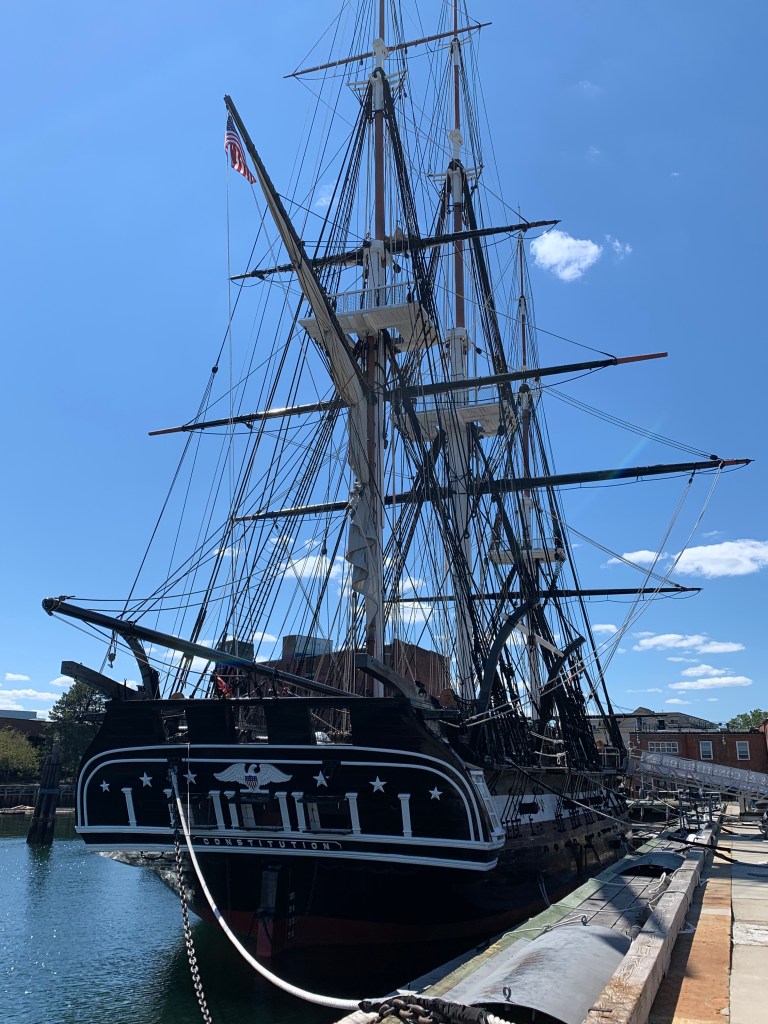 After taking a lunch break at a local trattoria (this neighborhood is wonderfully full of Italian restaurants), we made our way across the Charles River to visit the USS Constitution. That wooden frigate was commissioned a few years after Paul Revere’s ride, and fought nobly in a number of sea battles. Over the centuries it has of course become obsolete, and a few times it’s come close to being scrapped. But each time it’s been saved, and today it’s a carefully-restored and well-preserved floating museum at Boston’s Charlestown Naval Yard. It’s said to be the oldest ship of any type that is still afloat.