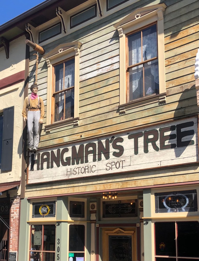There’s even a saloon on Main Street called “The Hangman’s Tree.” It calls itself a “historic spot” because it’s built on top of the stump of that very tree that once bore the hangman’s noose. And in case the name is too subtle, the proprietors have hung the effigy of a man from a noose outside the second-story window, just to drive home the point.