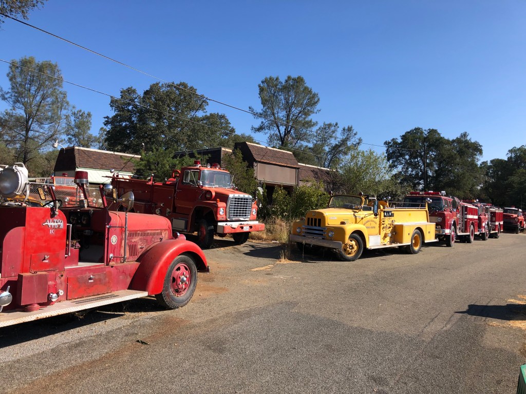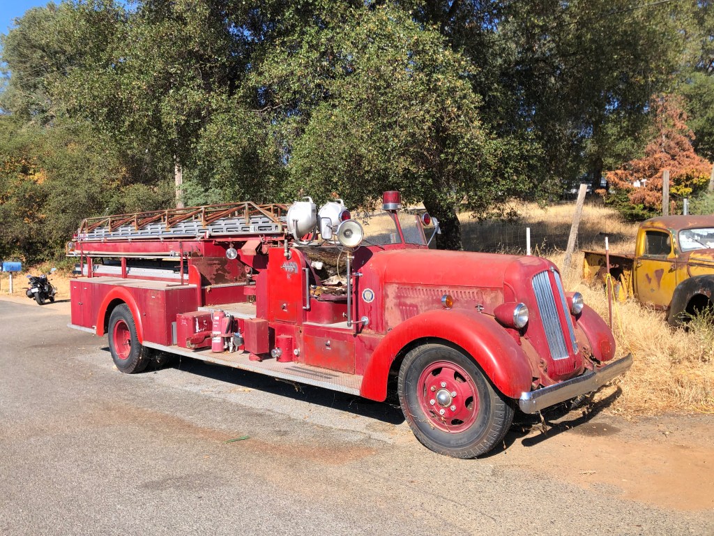 After Auburn, one just has to get through the rival cities of Grass Valley and Nevada City before highway 49 returns to a slow, winding, two-lane road. I didn’t feel much need to stop in those cities, given that they’ve become overrun with weekend tourists, posing hipsters, and college students showing off their starter tats. Between those two cities, though, I encountered a roadside collection of fire engines. They were parked in front of someone’s property, with no signs, no explanation, and no one to ask. Even an internet search came up empty.