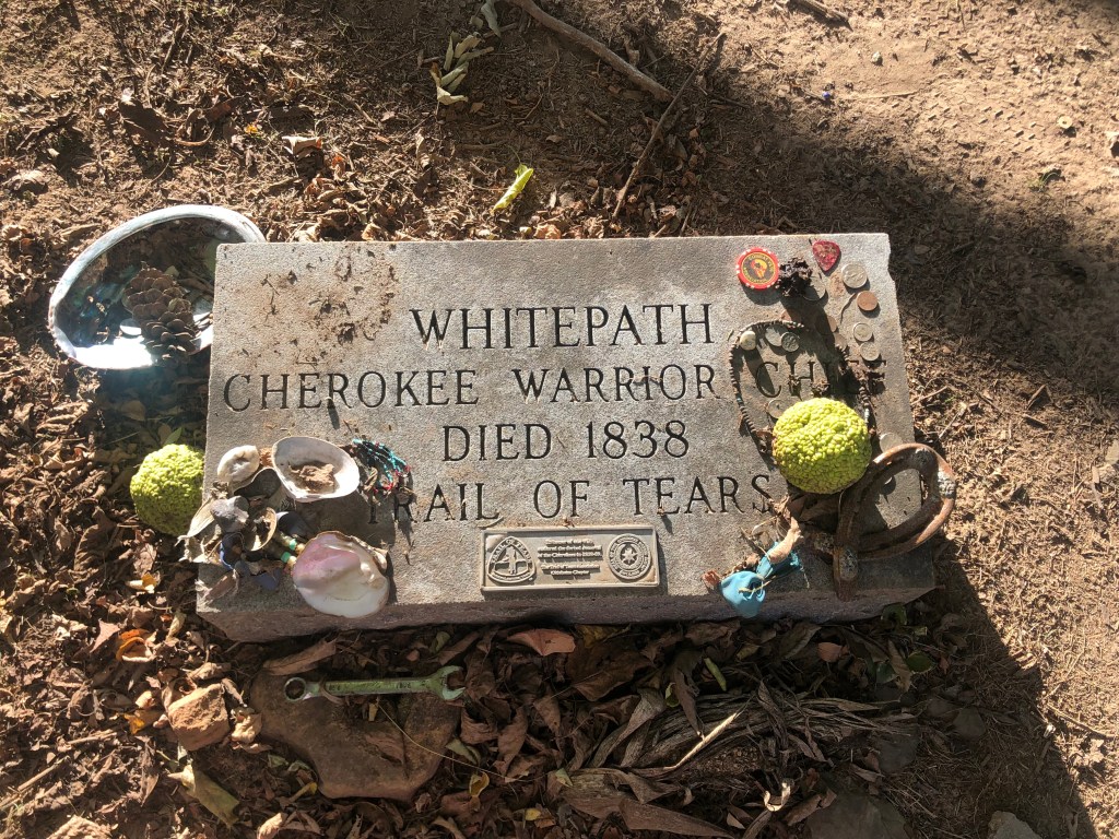 We spent some time chatting with Amy about her job (the Lord answered her prayers and led her to it two months ago), her home (on her parents’ 150-acre farm), the Trail of Tears (there’s going to be a big commemorative meeting of Indians at the Visitors Center this weekend), and various other topics. Sensitive that we were keeping her at her job well past closing time, we let her lock up while we moved outside to the area where the Cherokees had camped. Next to a creek were the graves of two Cherokee chiefs who had succumbed during the forced march. These are among the very few verified graves along the Trail of Tears.