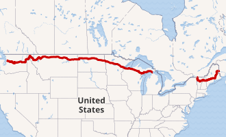 Anyway, the reason I raise all this is because Cousin Bonnie lives just off US Route 2, which is the country’s northernmost transcontinental route. Route 2 runs from Everett, Washington to Houlton, Maine, flirting dangerously with the Canadian border for most of the route. (For this reason it’s sometimes called “The Highline.”) Route 2 is actually a discontiguous highway, with the great lakes creating a watery lacuna between St. Ignace, MI and Rouses Point, NY. Observe: