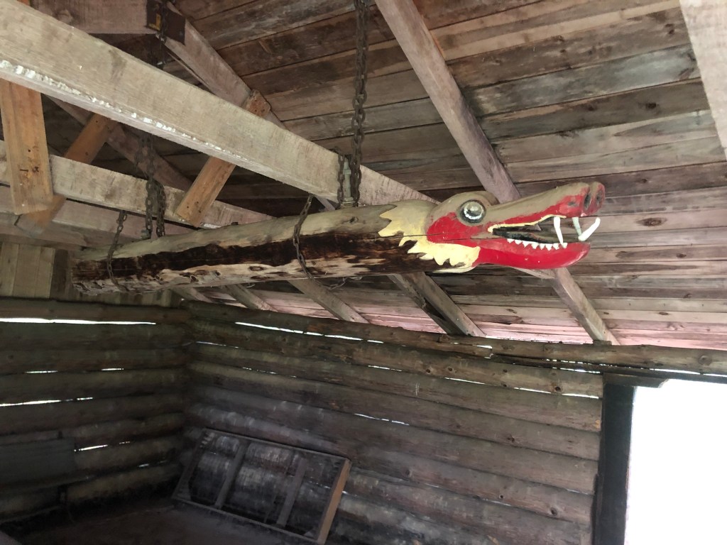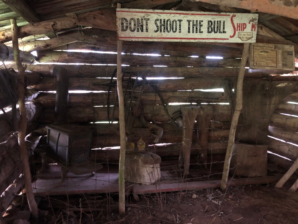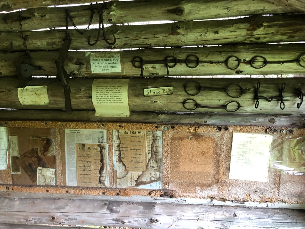 A rustic log cabin with a doorless open front stood in front of me, with a sign indicating that it was “Line Shack No. 1.” It was largely empty, except for a couple of picnic tables and a large, carved serpent (?) hanging from the rafters.