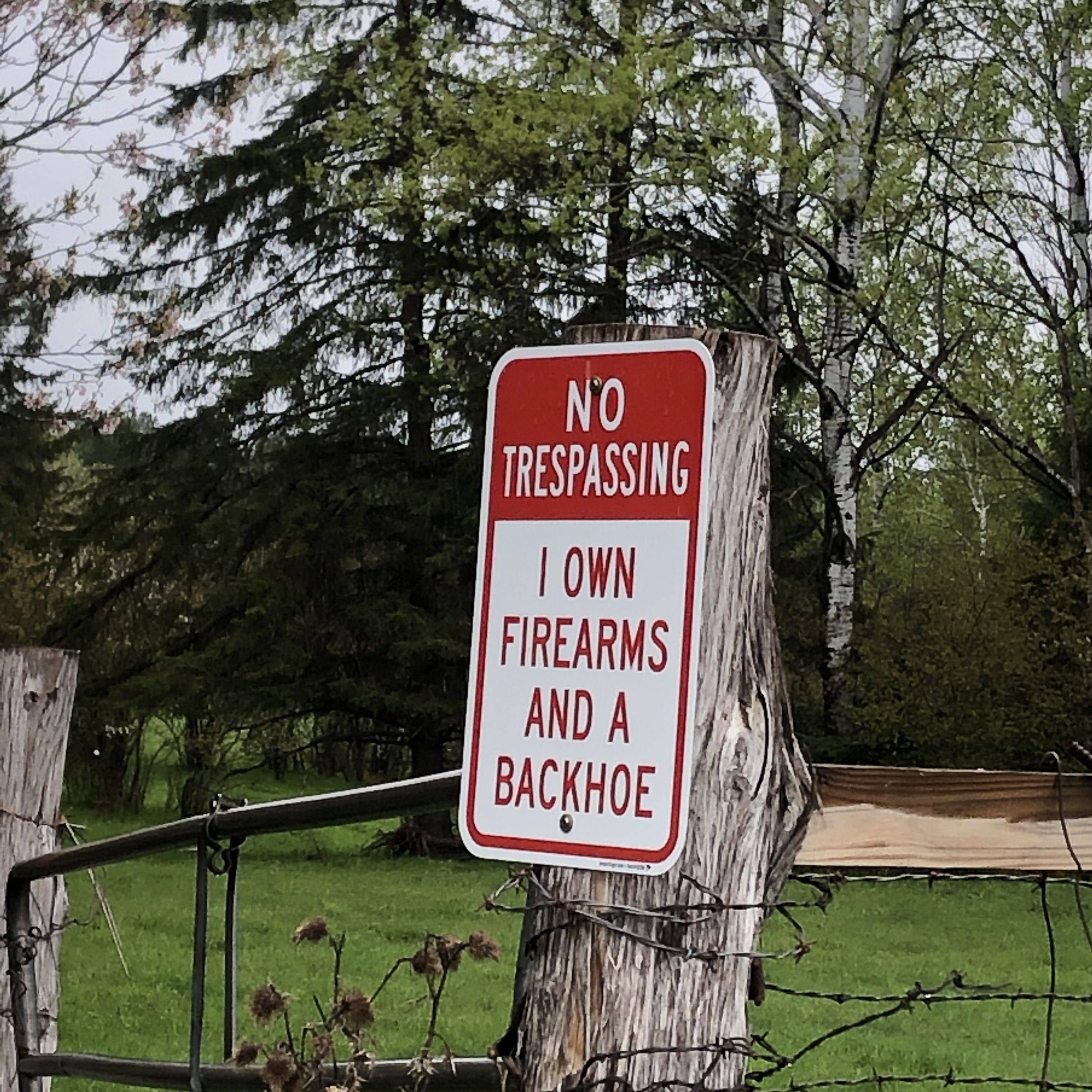 The sign stood next to a narrow dirt road which had been dampened by the morning drizzle. I put the Jeep into 4WD mode and turned onto the dirt side road. Wooden fences ran along both sides of the road, presumably marking private property. After about half a mile the road split into two, narrower dirt driveways. This sign was posted at one of the driveways: