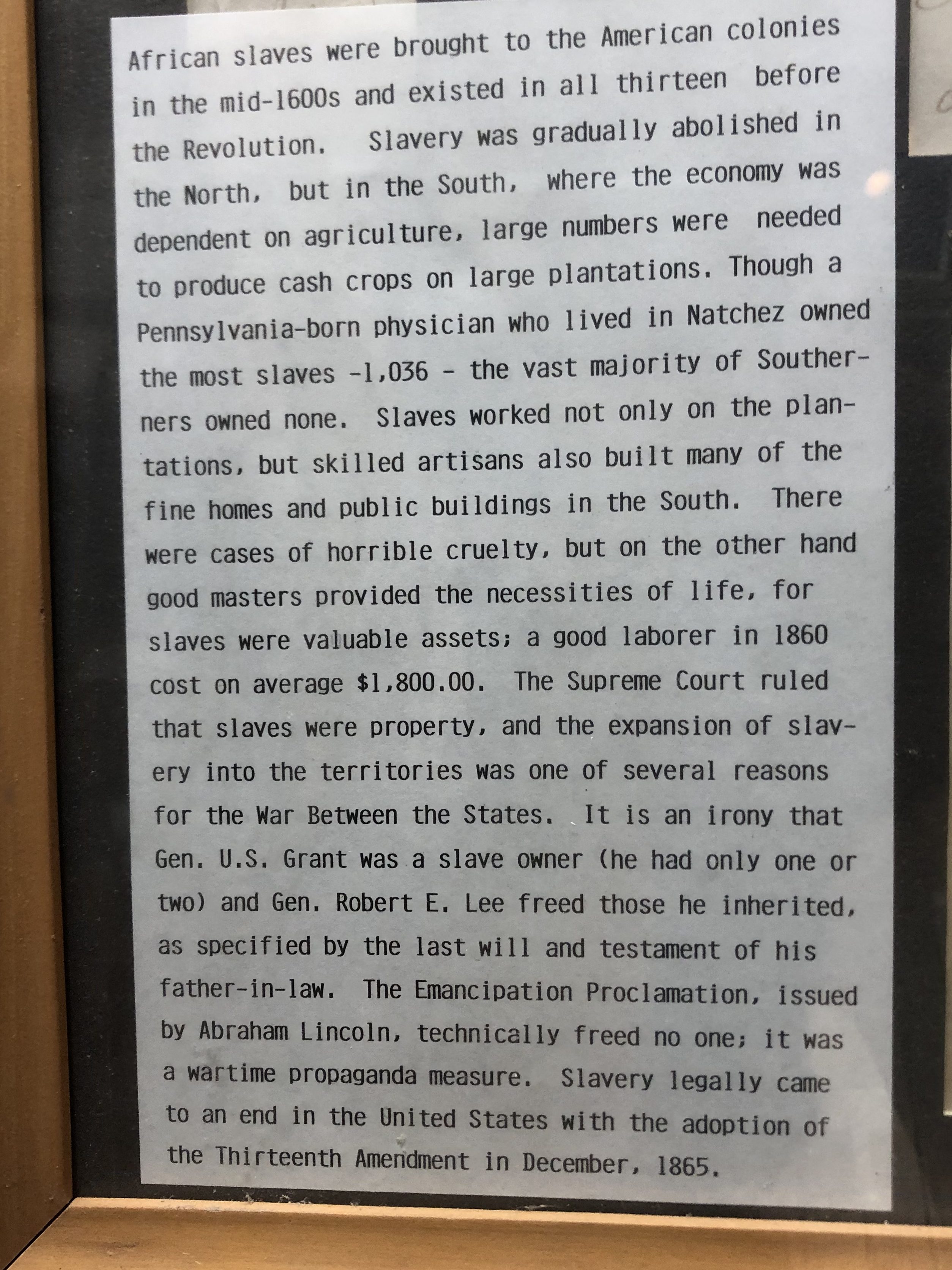 Now, you may be wondering what all this Civil War stuff has to do with the blues, which had been the nominal focus of this trip. I think it has everything to do with the blues. Notwithstanding the perspective of the Old Courthouse museum, the Civil War was about slavery. And the legacy of slavery is inextricably linked to the blues. The effects of slavery lasted well beyond emancipation, and to some extent they exist even today. I see it as I drive along Route 61– large numbers of African Americans are here because their ancestors were brought here as slaves. And today, 150 years later, they overwhelming live in de facto segregated communities that are significantly poorer than the white communities. I’ve been a distinct minority on the Blues Highway ever since I left Jackson…until I arrived here in Vicksburg, where I’ve been surrounded by white tourists.
