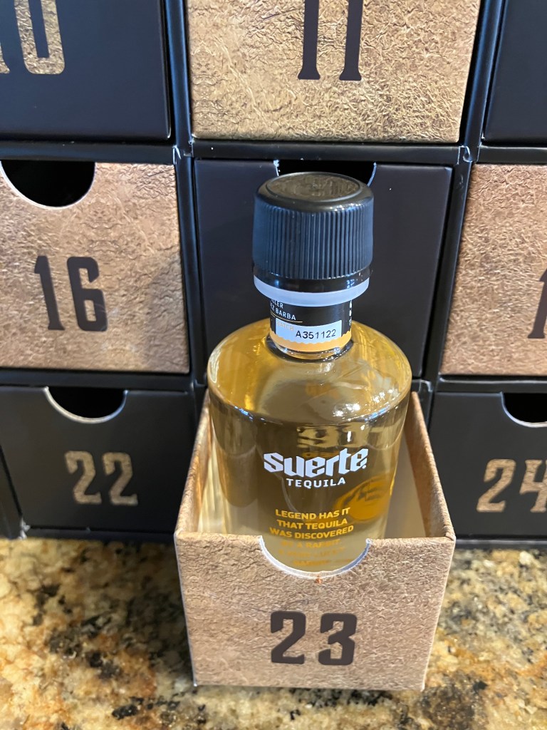 What we have here is an Añejo tequila, which, as we all learned in school, has been aged in oak barrels for one to three years. Thus we should expect this to be mellower and richer than the blanco and Reposado tequilas we tried earlier in this Advent project. (As I now think about it, it would have been helpful if the makers of this Advent calendar had assigned these three tequilas to three sequential days, thus allowing for more direct comparison of the different styles.) I do expect that this will be superior to the other two tequilas, as a result of longer aging. And consistent with that theory, this tequila is quite a bit more expensive; a 750 ml bottle will set you back almost $60 bucks.