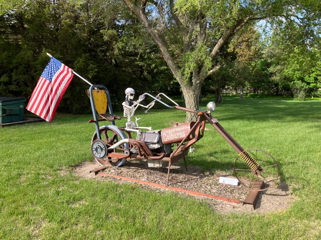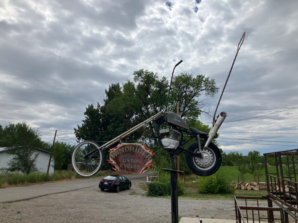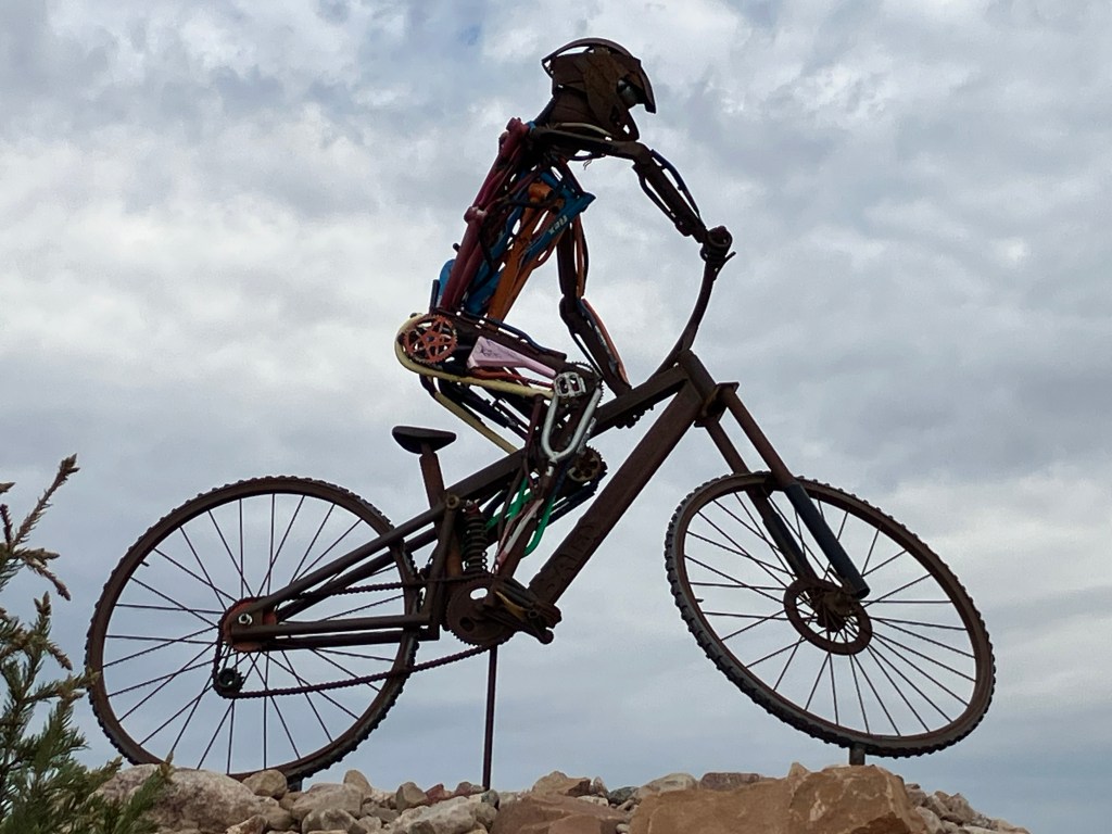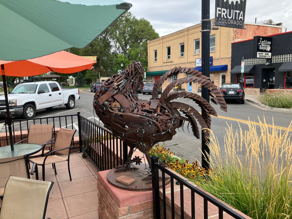 A friendly fellow drinking coffee at an outdoor table noticed me photographing the sculpture and gave me the story of Mike the Headless Chicken. (Trigger warning for those sensitive about food preparation by carnivores.) It seems that in 1945, a local farmer by the name of Lloyd Olsen was attempting to behead one of his chickens for dinner. His aim was a little off, and most of the chicken’s brain stem remained with the body. The chicken survived his beheading, flapping his wings and running around headlessly. What was Lloyd to do? He spent the next year and a half carefully feeding Mike (for that was the chicken’s name) individual kernels of corn through the throat and addressing Mike’s thirst with milk and water from an eyedropper. Mike became a sideshow attraction and gained national fame. Indeed, I remember reading about Mike in a “Ripley’s Believe It Or Not” paperback in the 1960s. Fruita still remembers Mike with the sculpture, T-shirts and other souvenirs, and an annual “Mike the Headless Chicken Festival” each spring. I am not making this up.