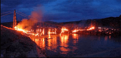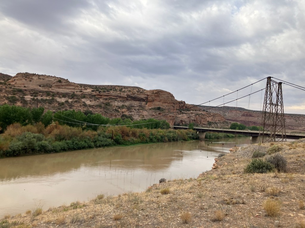 Turns out the Dewey Bridge (for that’s its name) was built in 1916 and is Utah’s longest suspension bridge. It was fully restored in 2000….and eight years later some kid was playing with matches and the whole thing went up in flames.