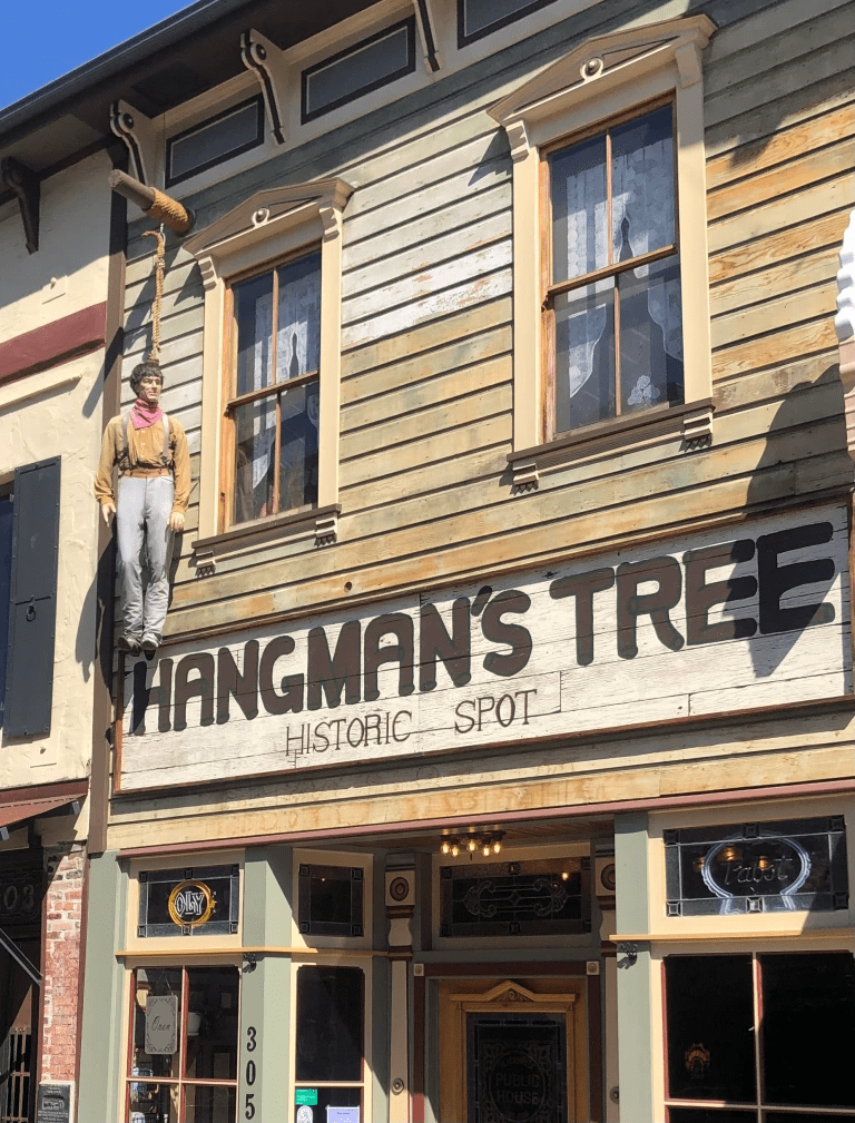 But let’s get back to the purpose of today, which was to complete my trek to Placerville, Colorado. You’ll recall that the California version of Placerville was originally called Hangtown, and the tree where those hangings took place (in 1849) stood on Main Street for many years. Even though it was cut down in 1853, the stump remains in the basement of an old Main Street building, where a dummy perpetually hangs from a noose.