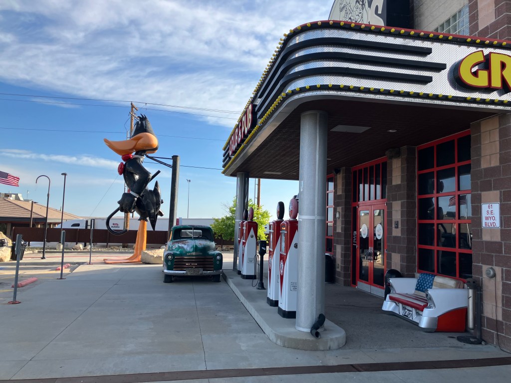 The place is flanked by a giant Daffy Duck and a giant Bugs Bunny.