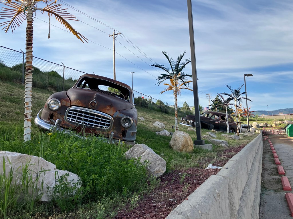 The back parking lot has a Cadillac Ranch vibe, with the hulks of numerous old cars planted in the landscaping.