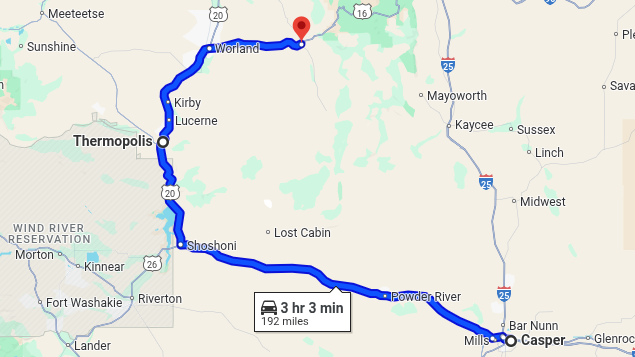 Today’s route: From Casper (lower right) to Worland (where I departed Route 20) and east to Ten Sleep.