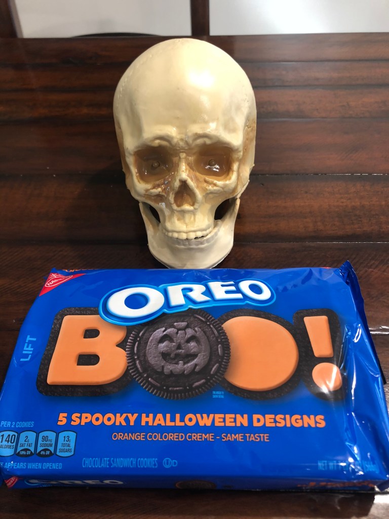 Packaging. In Pavlovian fashion, I salivate every time I see this package. But aside from the promise of the gastronomic goodness inside, the package also has some worthy nods to Halloween. Such as the prominent use of orange lettering. There’s also the word “BOO!” spelled out in specially-shaped Oreos. And an Oreo with a smiling Jack O-Lantern embossed on its front appears as the middle “O.” The package also promises that the cookies have “5 spooky Halloween designs.” This all adds up to major Halloween Ju-Ju. Still, the design seems a little bare for a Halloween treat. No cobwebs? No skeleton hand holding a cookie? No bats flying the background? There’s plenty of bare, blue space that could have accommodated something along those lines. I’ll give it 2 points.