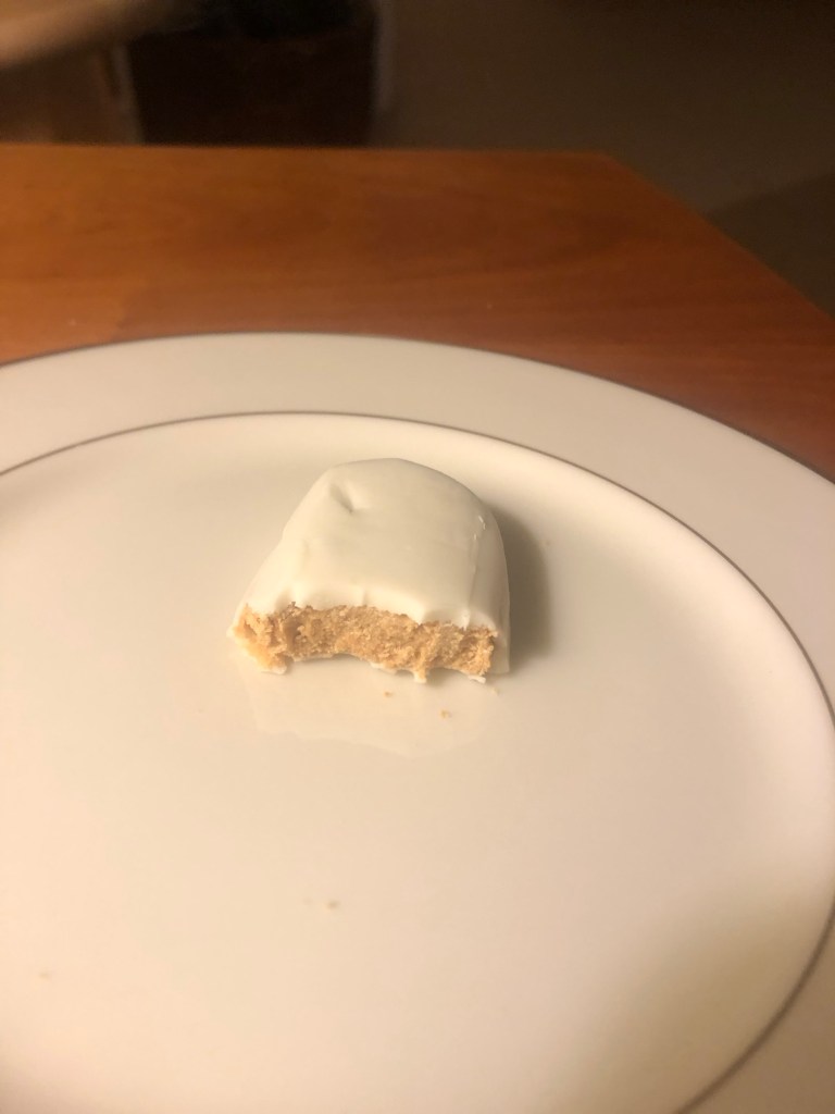 3. Taste. Oh happy day! The white chocolate pairs with the peanut butter even better than the milk chocolate did. And that earlier combo was no slouch. The peanut flavor is really allowed to shine through, and the delicate sweetness of the white chocolate nicely balances the salt in the peanut butter. This definitely has earned 3 points.