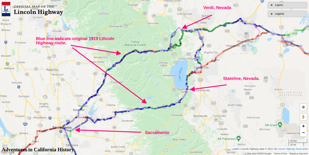 It should be noted that the Lincoln Highway forked in Reno, providing two routes into California. One (“the Pioneer Route”) went over Donner Pass and roughly followed modern Interstate 80. The other (“the Scenic Route”) passed south of Lake Tahoe and then roughly followed modern US 50. The two segments linked up again in Sacramento.