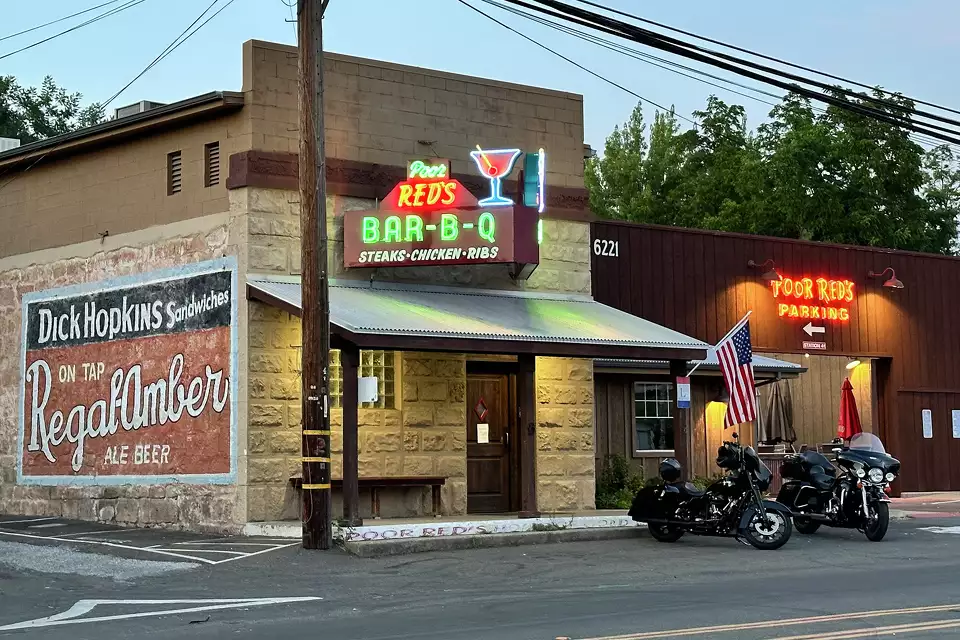 “Originally constructed as a weigh station for Wells Fargo, it previously operated under the name Kelly’s Bar from 1927 until 1945. Poor Red won the bar in a game of dice, and he and his wife and bookkeeper Rich Opal took it. The murals currently on the walls of Poor Red’s were installed in the 1940’s. They depict former employees and patrons, including their dog, which used to sit out front. It is rumored his dog ran for office, but he lost.”