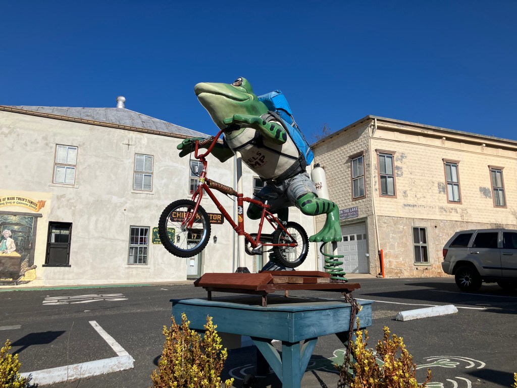I also appreciate how Angels Camp (pop: 3,700 and the only incorporated city in Calaveras County) has leveraged its purported role in Mark Twain’s story “The Celebrated Jumping Frog of Calaveras County.” The little buggers are everywhere!