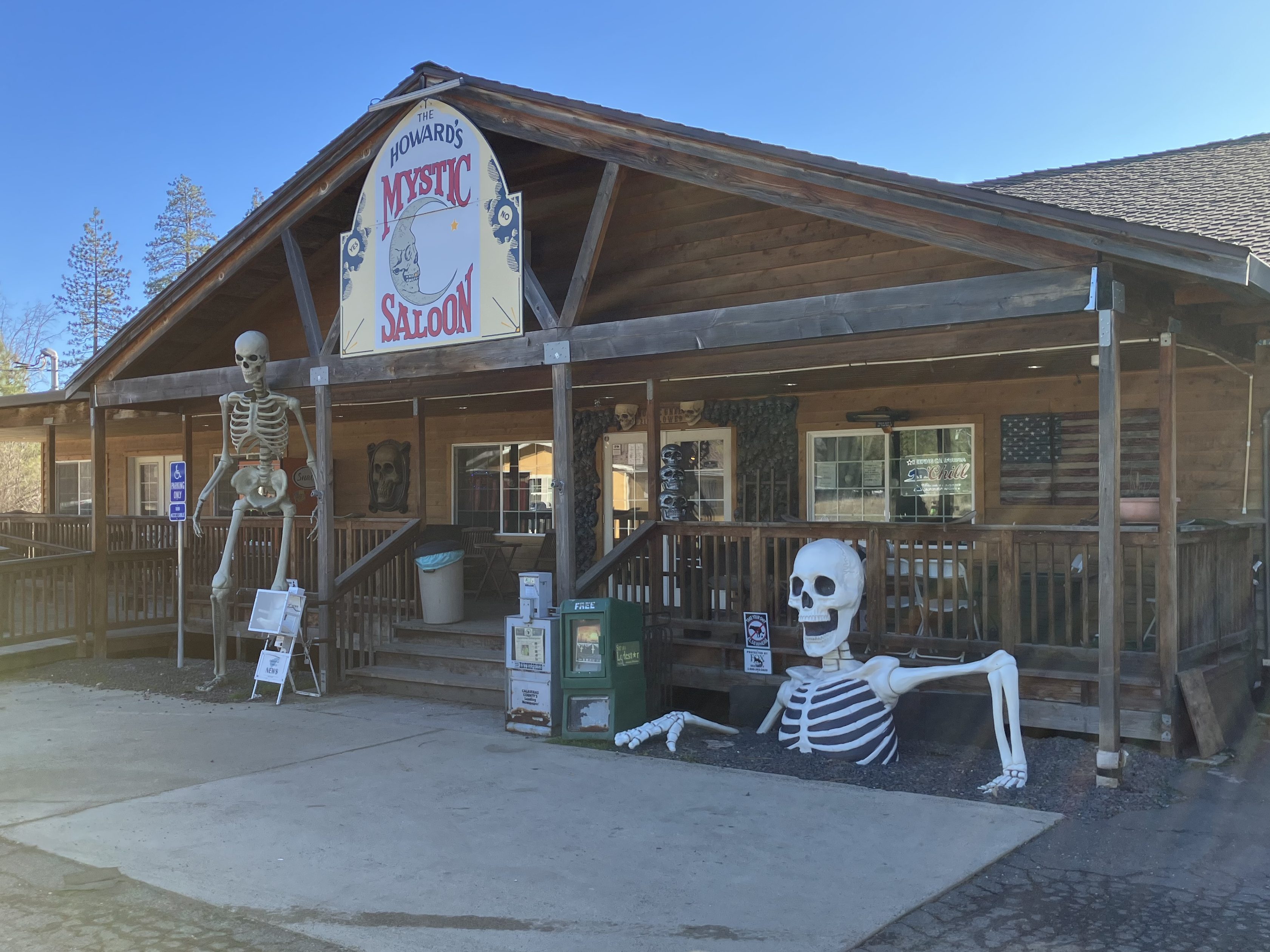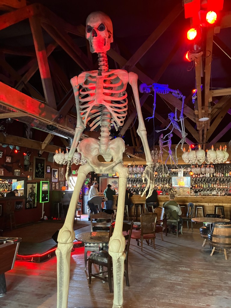 Walking into Howard’s Mystic Saloon is like entering an ossuary. You’re greeted by a giant skeleton standing just inside the door, and as your eyes adjust to the darkness you notice that all the chandeliers are decorated with skulls and bones. More skeletons hang from the ceiling, and the entire wall behind the wall is covered with black skulls.