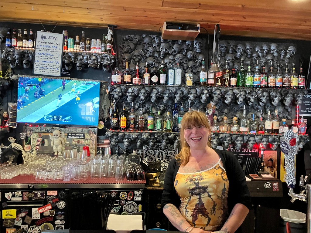 I asked the bartender, Ivory, for the story, and she told me the skulls are not meant as a reference to Calaveras County. In fact, the owners (Curtis and Tana Howard) own another skeleton-themed bar in Oakland. At this point a jovial man with a beard and a cowboy hat sitting at the end of the bar said “This place is tame compared to their Oakland place!”