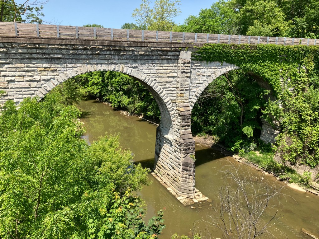 I took most of the following photos from a trail that was once the “towpath” along the Ohio and Erie Canal. Mules labored along these paths pulling boats and barges up the canal via ropes. The modern trail/historic towpath runs alongside the canal for about 100 miles. I walked less than a mile of this path, passing under and next to innumerable bridges–some still in service, and some decommissioned.