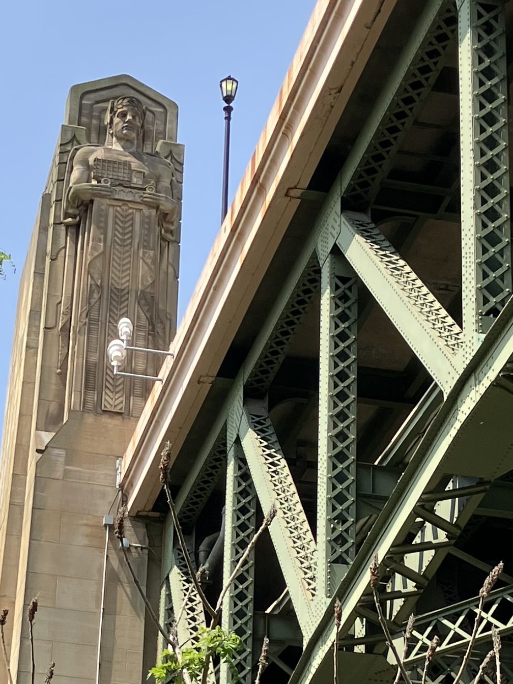 Detail of one of the eight “Guardians of Traffic” on the 1932 Hope Memorial Bridge. Note that he’s holding a truck.