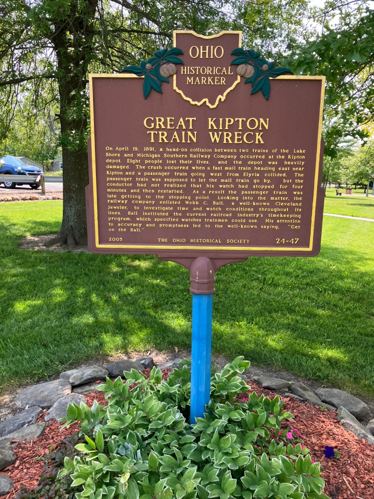 Next up was the town of Kipton, OH. A new reader named Bob suggested I check out the site of the “Great Kipton Train Wreck of 1891.” There’s a marker at the site explaining how a head-on railroad collision occurred because the watch of one of the conductors was four minutes slow. Leaving aside the issue of whether it’s wise to create railroad schedules that have two trains occupying the same space just minutes apart, this accident prompted the railroads to adopt strict standards for railway timepieces.