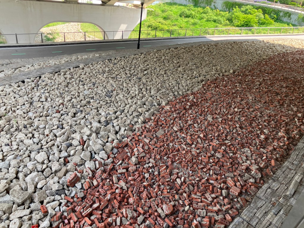 Rubble from the demolition of old bridges and associated structures, now used as ground cover next to the Towpath.