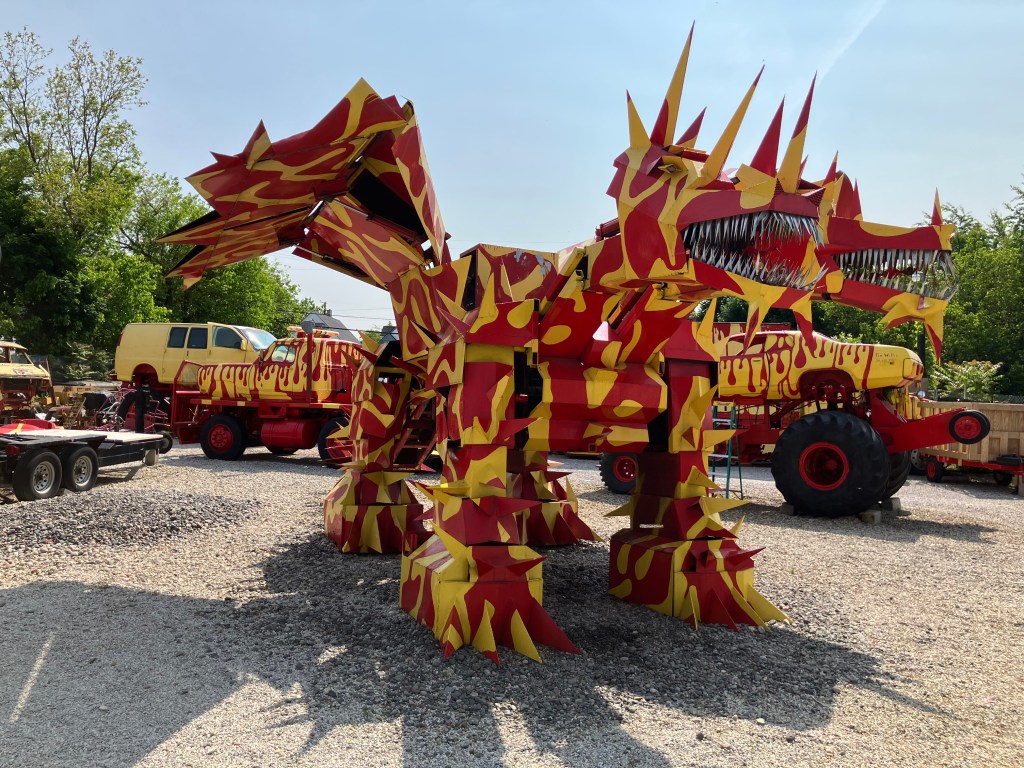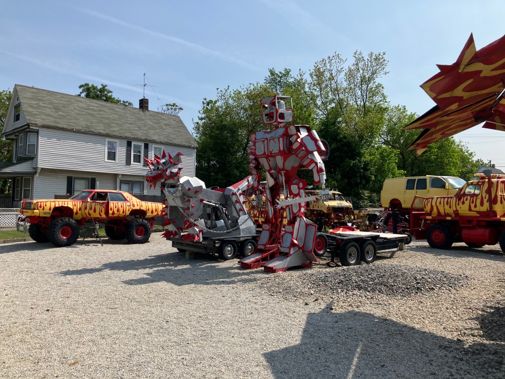 It’s all the work of local artist Tim Willis. And those robots and dragons actually move with electric servos, and the trucks have powerful engines that presumably could get them into a monster truck show. My readers will recall that I have a soft spot for yard art; this is incredible. Spend a minute or two hearing from Tim himself: