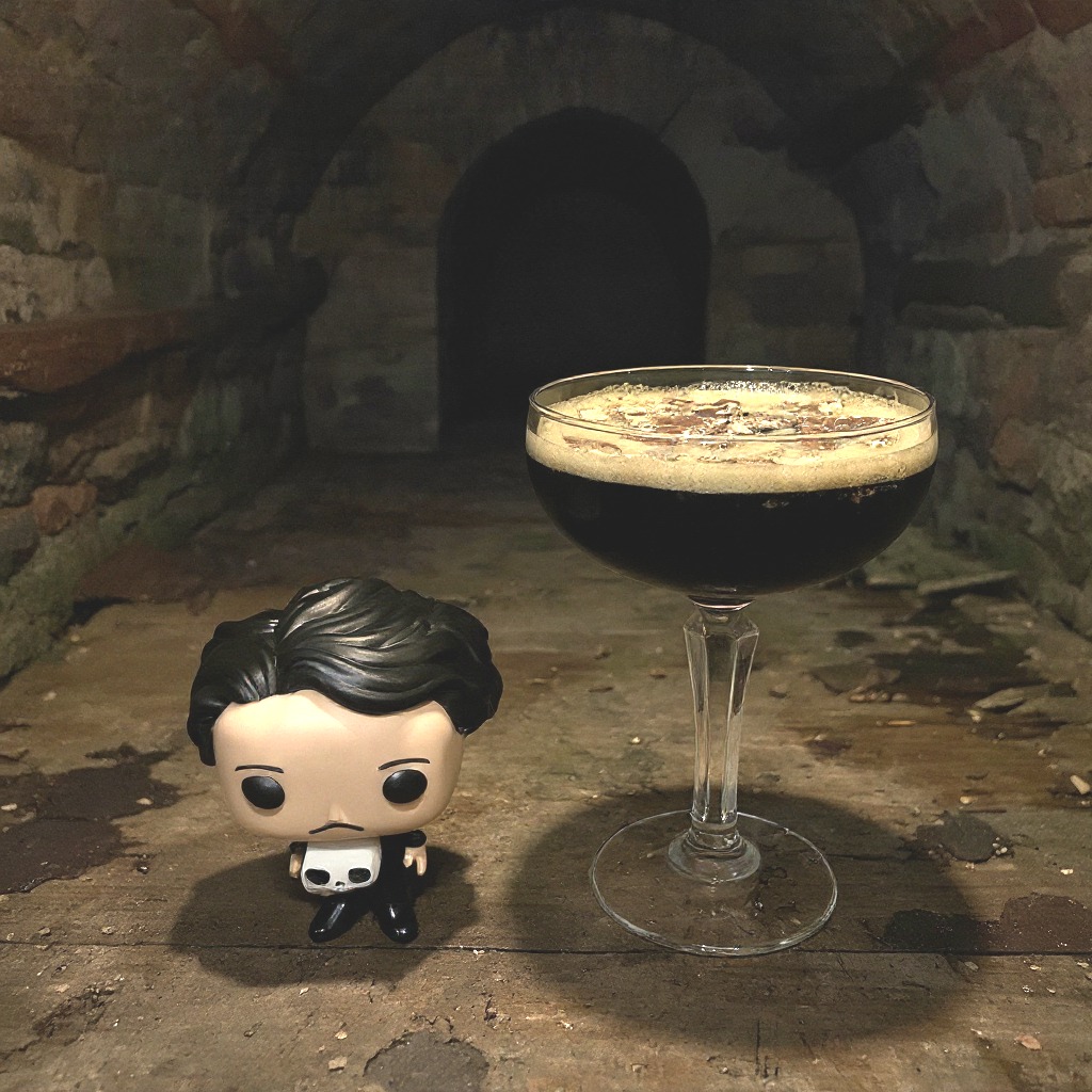 It goes without saying that this drink must be black in color. I started with Kahlua and coffee, which I further darkened with activated, food-grade charcoal. A bit of absinthe adds an unexpected anise element (and supposedly absinthe was one of Poe’s vices). Meanwhile, a Kit-Kat bar emphasizes the cat theme. (Readers of a certain age might recall the Kit-Kat commercials in the 1970s, featuring a lion as the cat. It was even less funny than it sounds here. And, sadly, the Kit-Kat bar is even less delicious in this drink than you might hope. Still, we persevere.)