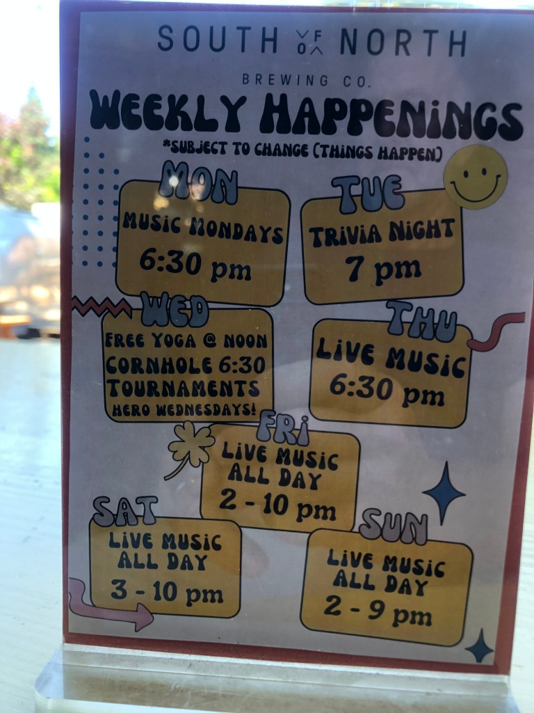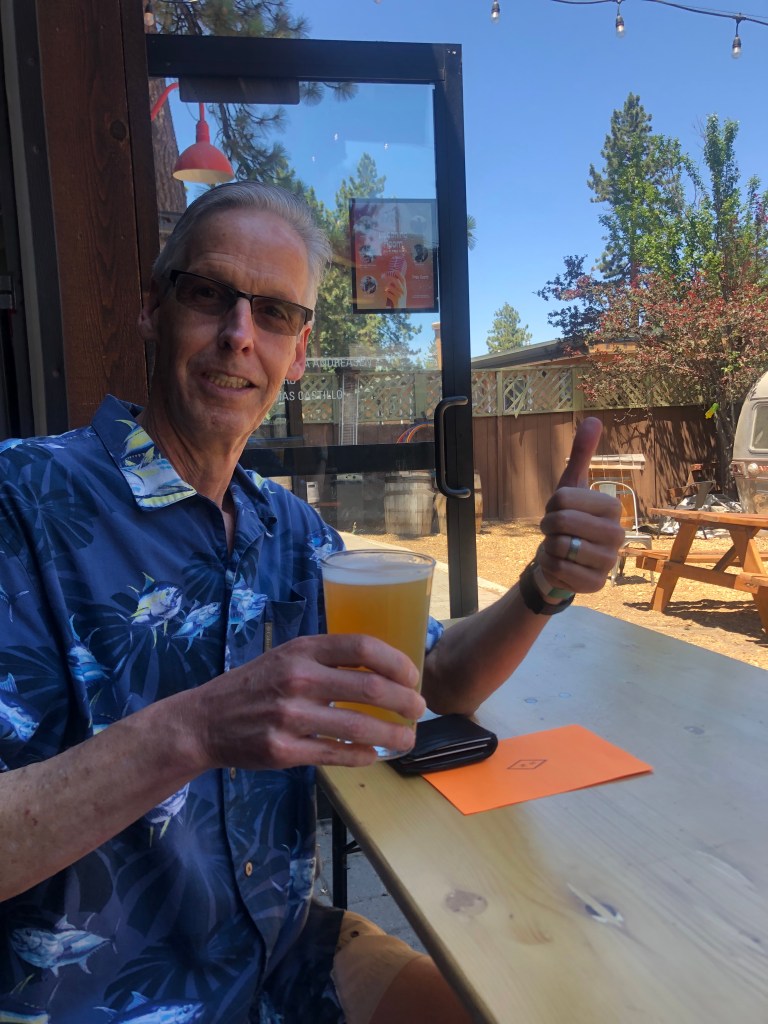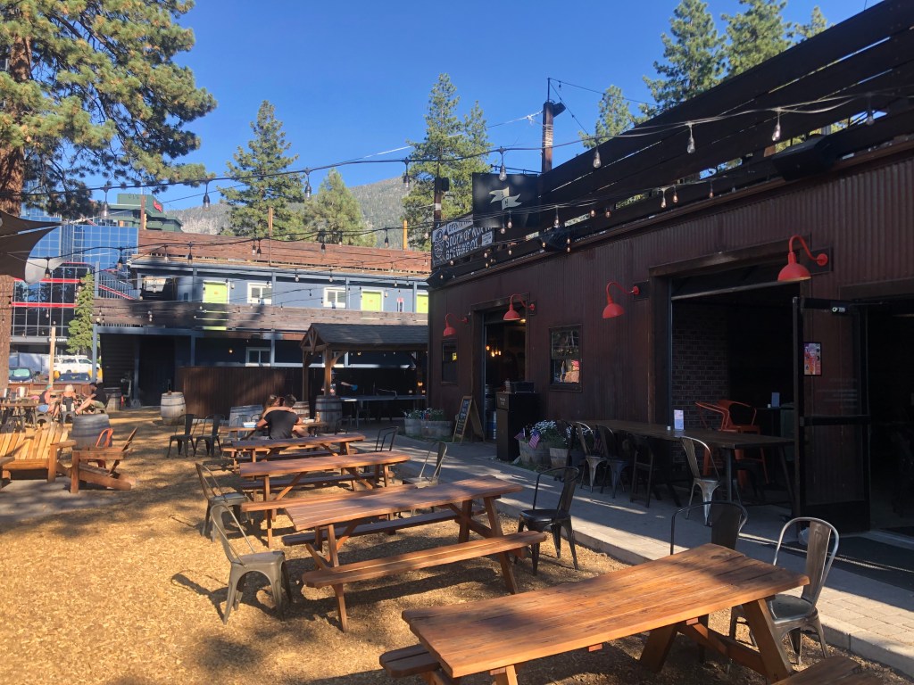 Near Zephyr Cove is a brew pub with the confusing name of South of North Brewing Company. This is where Bruce and I went for lunch, and we were glad we did. It’s nestled into a relaxing setting, with plenty of outdoor seating under pine trees and solar shades. Amidst the outdoor seating are a ping-pong table and the now-requisite Cornhole game. A rustic but homey building houses their service counter/bar, an event space, a bar, and their brewing operation. Yes, they brew their own beer. Today they had eight of their delicious beers on tap, plus another half-dozen guest brews. Notably, they are the only brewery in the area to draw their water directly from Lake Tahoe, and I want to think it makes a real difference in the taste. Didn’t some Brand X brewer used to say “it’s the water, and a lot more”?