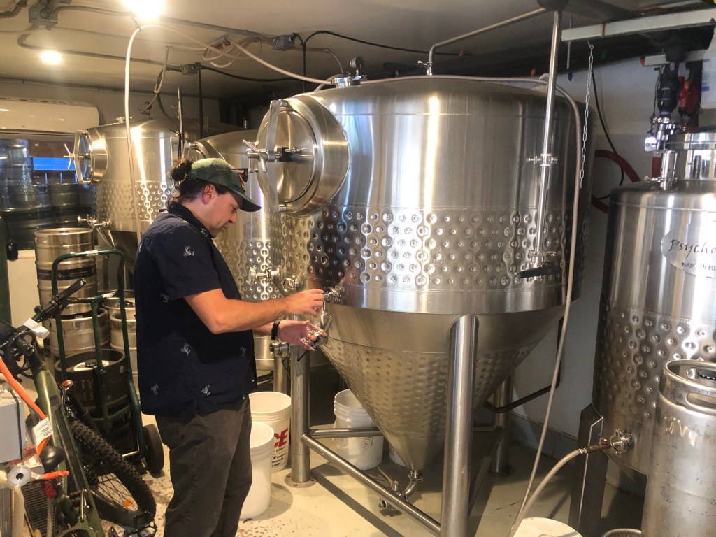 The head brewer is a Sacramento transplant named Thomas. He’s been here for a little over three years, and with a single assistant they make all those beers. The brewing space is a converted hotel room. (Their business abuts an old hotel.) Their brewing tanks were custom designed for the space.