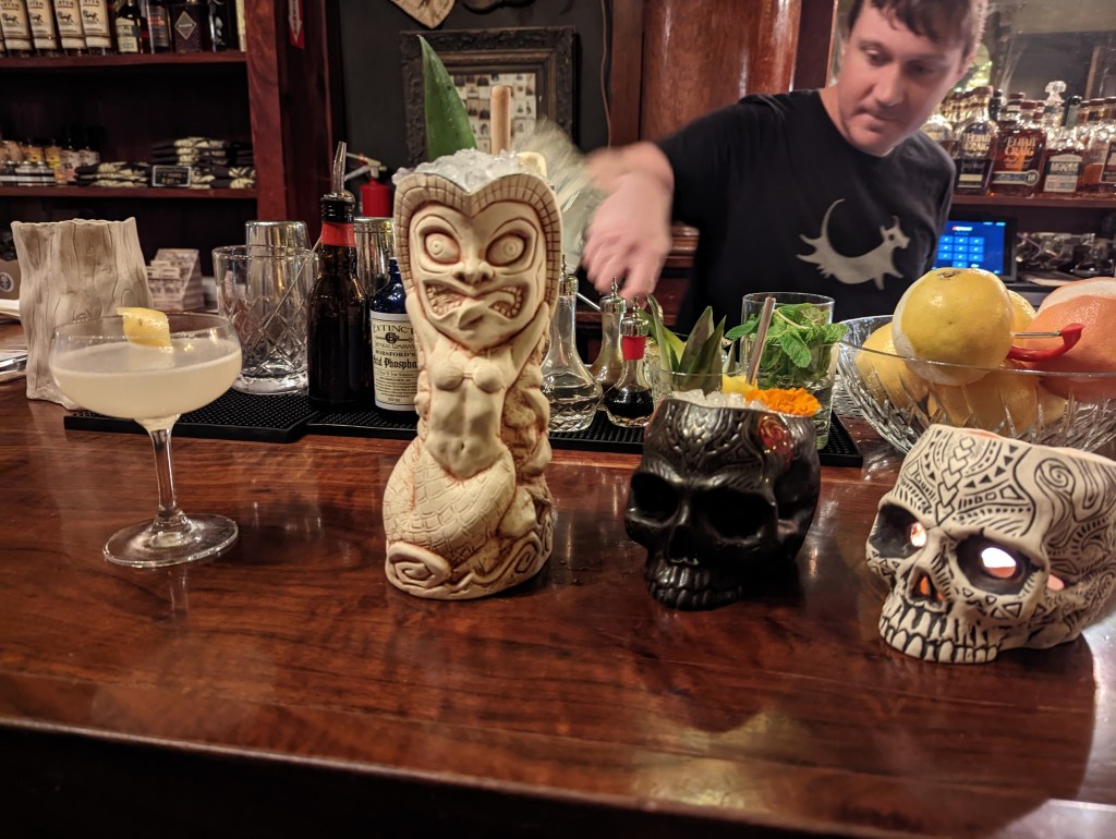 I asked Chris to make me a Halloween-themed cocktail. He said he didn’t have anything especially kitchy in his repertoire, but he did offer to make a Corpse Reviver. (Alert readers will recall I made one of these myself, after my misadventures with Chartreuse.) I ordered one of his corpse revivers, and he indulged me by adding a sidecar in the form of a little cauldron. Kitch triumphs!