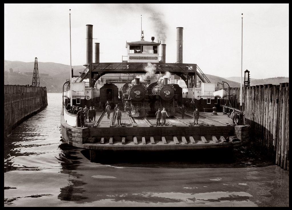 But the same year the Banta train depot was constructed, the Southern Pacific opened a new, shorter route from Sacramento to the Bay Area. This route crossed the Carquinez Strait, shaving off several hours from the old route over Altamont Pass. But since the Benicia-Martinez railroad bridge wouldn’t be constructed until 1930, trains were ferried over the Strait. Seriously. An enormous ferry dubbed The Solano was constructed for this purpose. Westbound trains would slowly chug over the Benicia Pier, roll onto the Solano, and make the half-hour trip to Port Costa, about a mile across the water. From there the trains would return to the mainline and continue to the end of the line in Oakland.