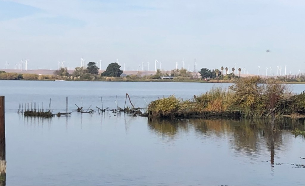 Remains of the Solano in Antioch. We’re looking at the port side of the ferry, with metal rods from the bow poking out of the water on the left.